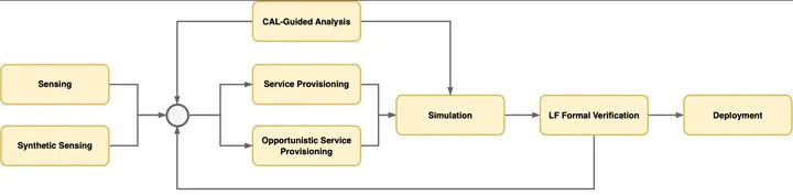 ODT engineering workflow: perception via Sensing and Synthetic Sensing; (Opportunistic) Service Provisioning; Simulation with LF-based formal verification under CAL-guided analysis; and Deployment.Abstract
